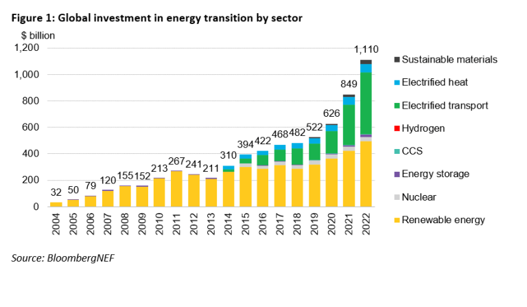 Global investment in the low-carbon energy transition totaled $1.1 trillion in 2022 – a new record and a huge acceleration from the year before – as the energy crisis and policy action drove faster deployment of clean energy technologies, according to a new report from research firm BloombergNEF (BNEF).